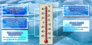 Batteries – lose power as it gets colder and they get older. If your battery is approaching 3 years or more or it is really cold there are a couple of steps you can take to help it start your car. A battery warmer in extreme cold weather is a great investment. Storing your car indoors also helps. Although it is expensive, replacing your battery after 4 years will probably save you a great deal of frustration. A well-tuned car also helps.