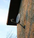 This is an example of a small dish being installed on the side of a wall of a home with no siding or wall covering. The cable from the dish runs down the wall and enters the home through the basement somewhere and then is distributed to the right location within the home. The installer was able to find sufficient height this way to gain line of sight with the satellite for this home owner. Once the home owner decides to cover the walls of his home with brick or siding he will need to remove the dish and reinstall it on top of the siding, which will cause holes to penetrate his new siding. As long as they are sealed properly he will have no problems with leakage.